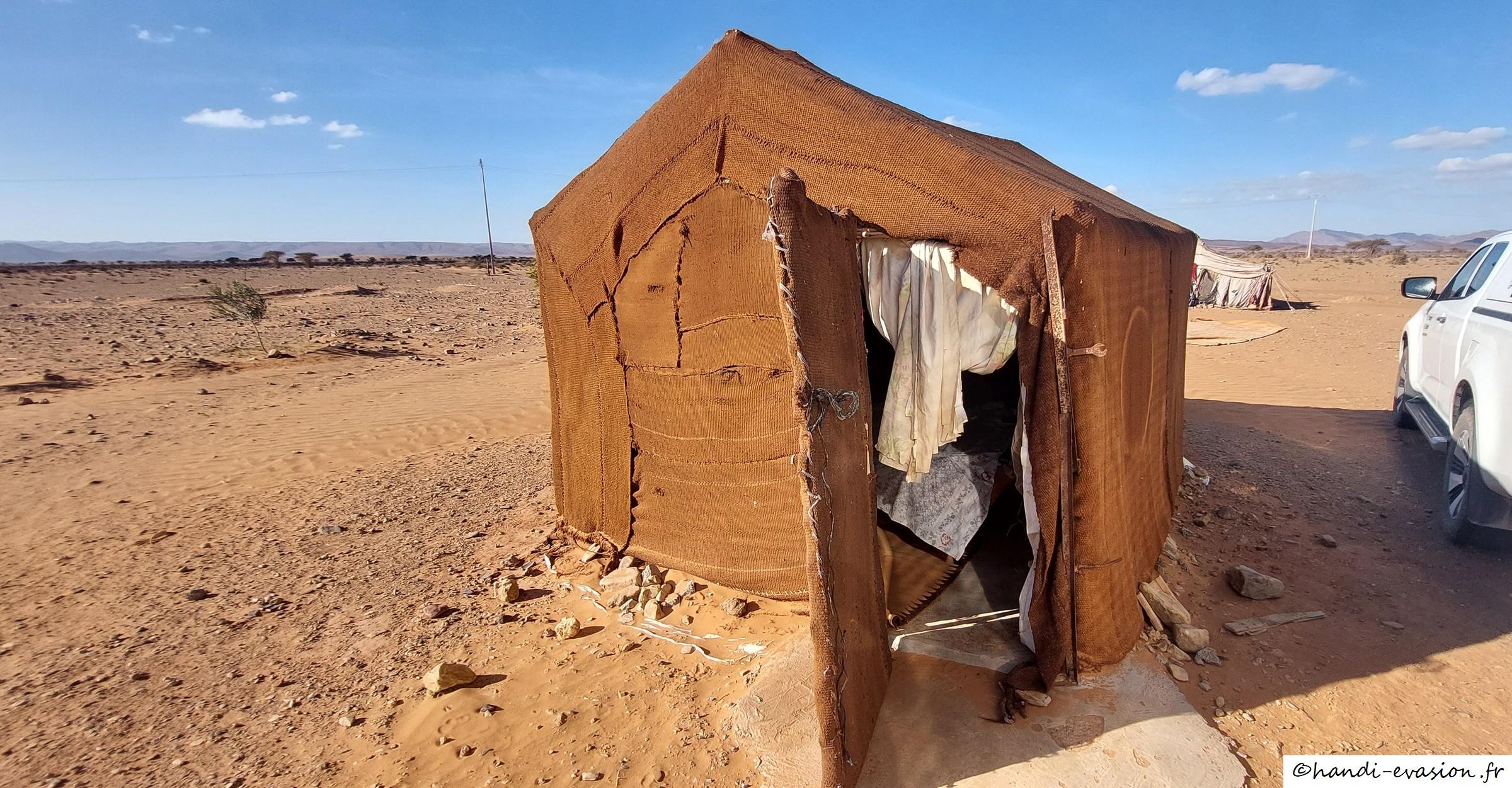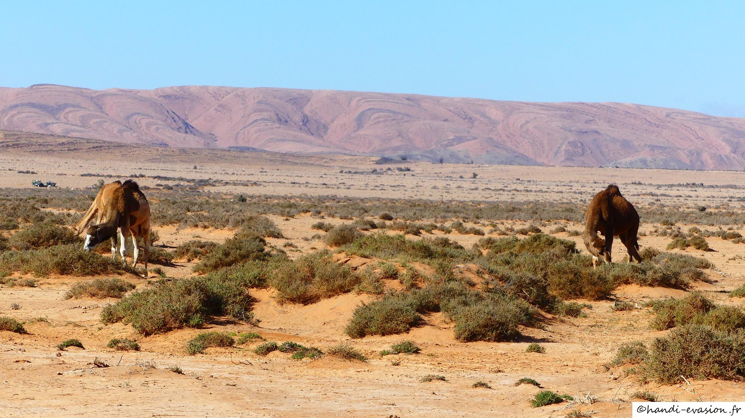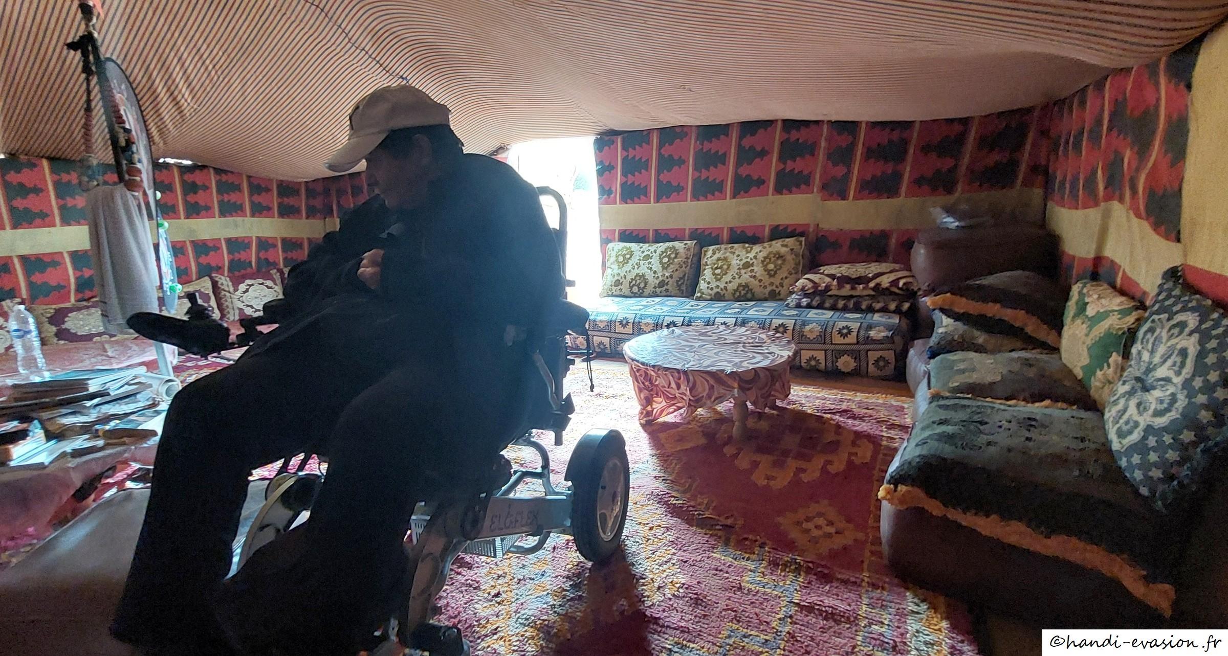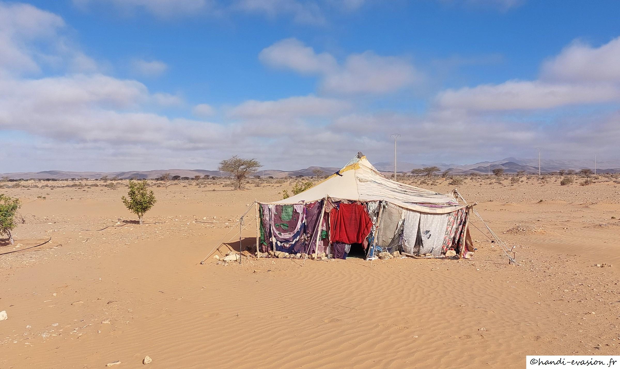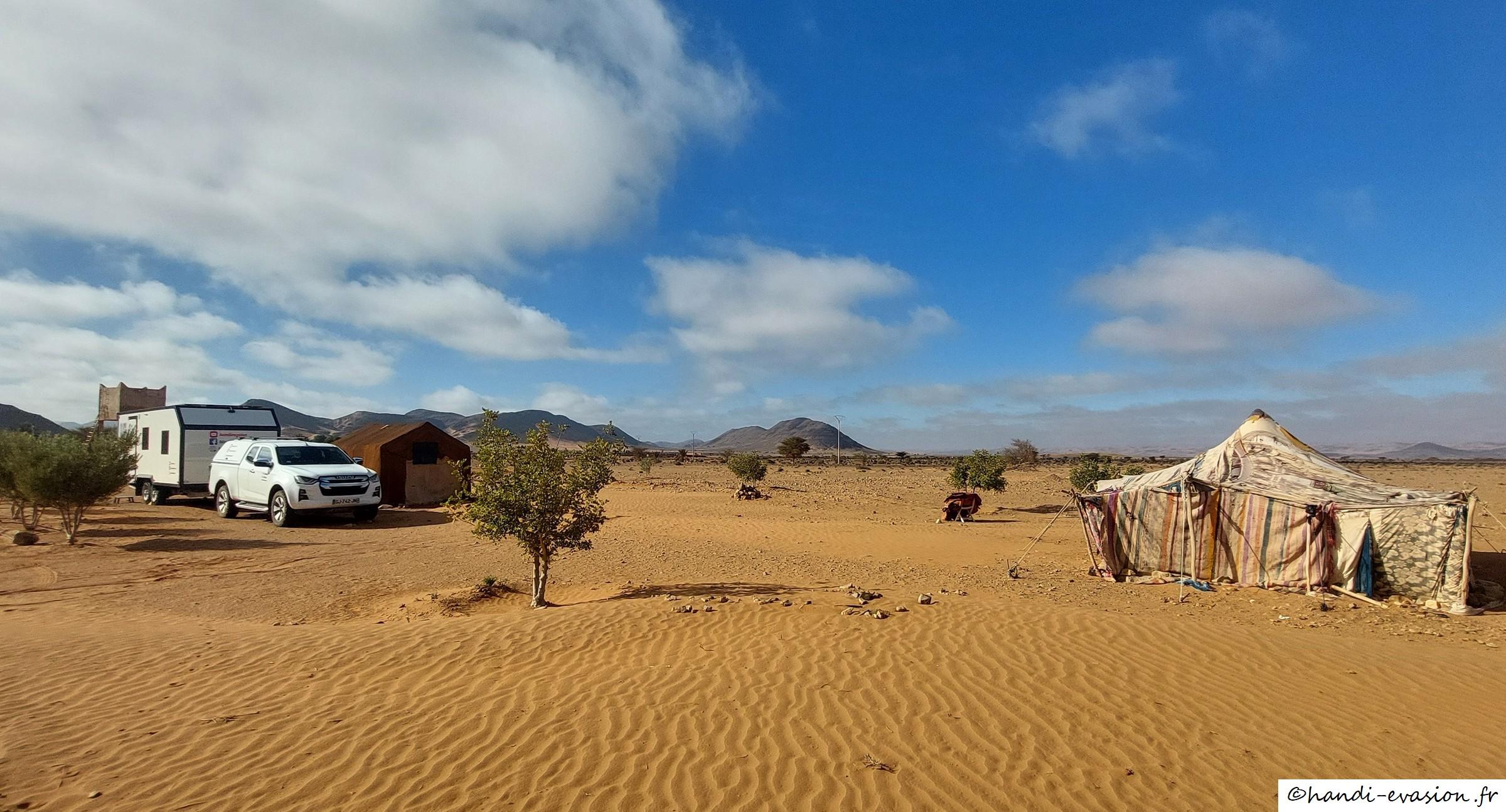 Accueil chaleureux avec le thé sous la tente, Hassan est très gentil, nous sommes allés avec lui voir les peintures rupestres avec balade dans le désert (avec notre 4x4), rencontre avec un troupeau de dromadaires.